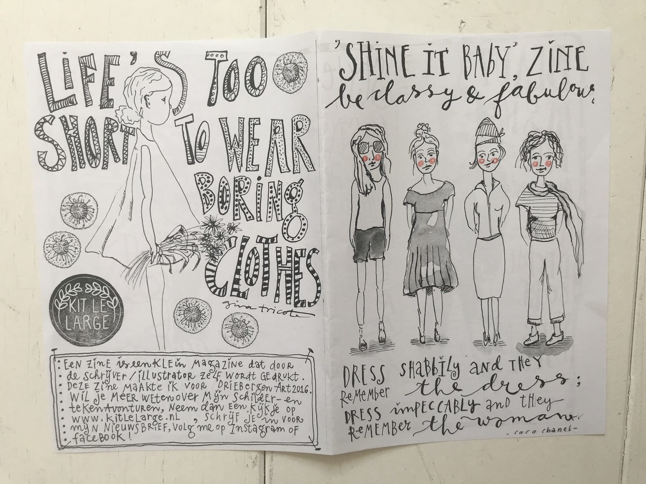 Een Zine maak ik vaak op A5 formaat en bestaat altijd uit een veelvoud van 4 pagina’s. Het drukken kan in zwart/wit of kleur en andere formaten en oplagen zijn ook mogelijk.